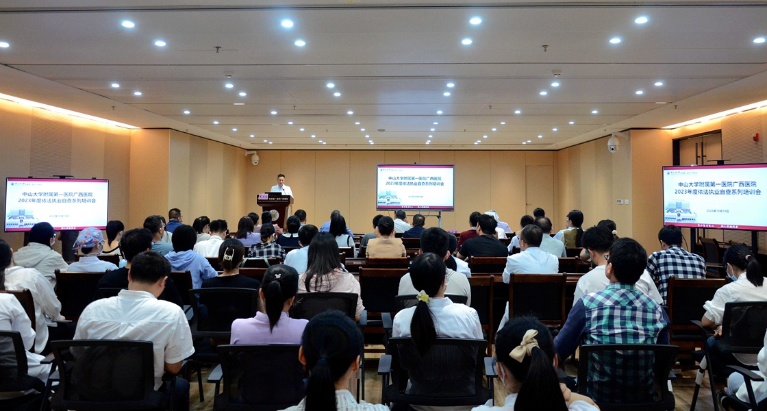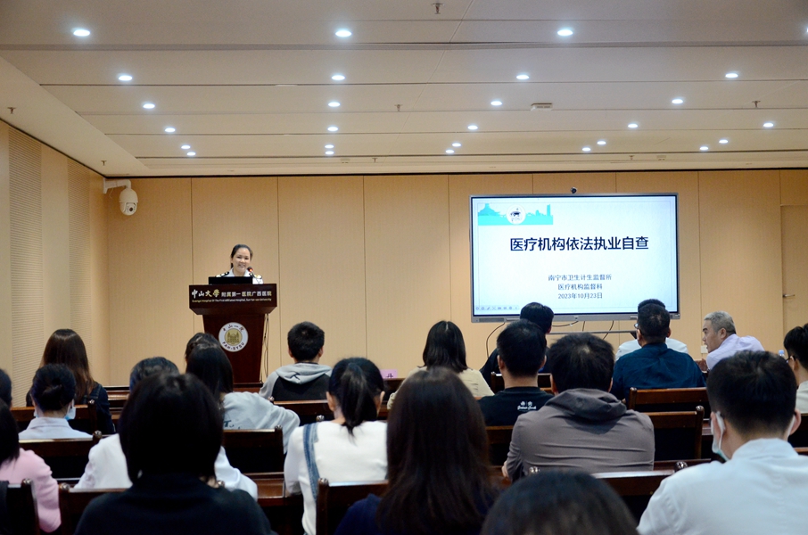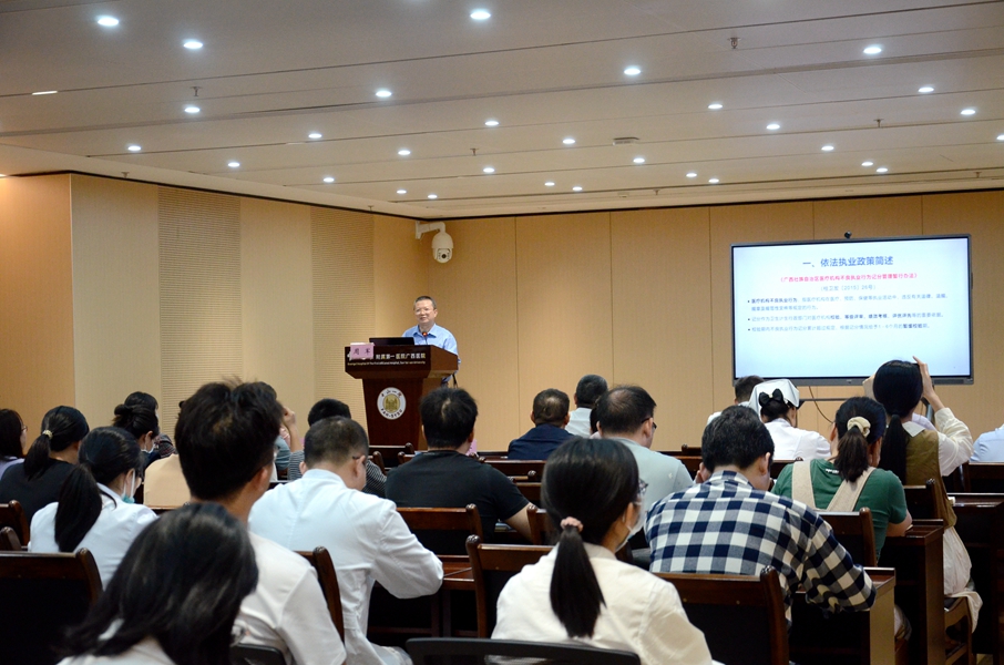 为深入贯彻落实医疗机构依法执业自我管理主体责任,增强医务人员法治意识,规范从业行为,提高医疗服务质量和安全,10月19日、23日,老虎机app (自治区人民医院医院)(简称老虎机app )举办2023年度依法执业自查系列培训会。我院党委书记张国、副院长夏文豪及相关临床、医技、职能科室医护人员参加。培训会邀请了自治区卫生监督所监督四科科长/四级调研员周军,南宁市卫生计生监督所医疗机构监督科科长冯云新、陈丹,自治区人民医院医疗管理科李思华进行授课。培训会由夏文豪主持。
