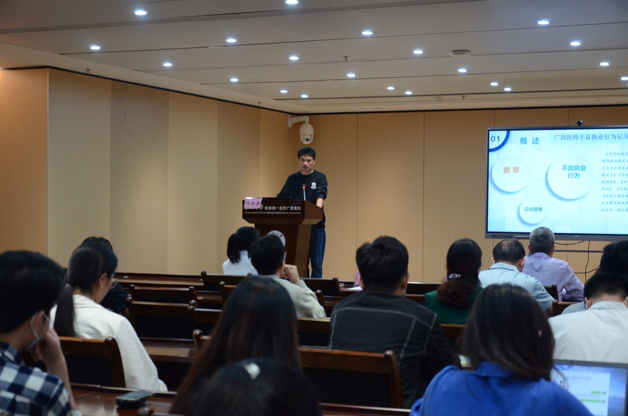 冯云新从自身多年执法过程中的一些典型案例入手,以案释法,围绕医疗机构及医务人员不良执业行为相关的法律法规、规章制度,记分标准、记分规则为大家进行了详细阐述,并就如何增强医务人员执业意识、规范执业言行、科室如何更好的开展依法执业自查工作等内容进行授课。