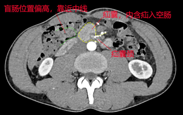 ▲CT增强扫描可见,患者空肠经肠系膜上动脉与腹主动脉之间疝入右上腹部,由于已进行胃肠减压,故肠管积液、扩张征象消失;患者盲肠高位。