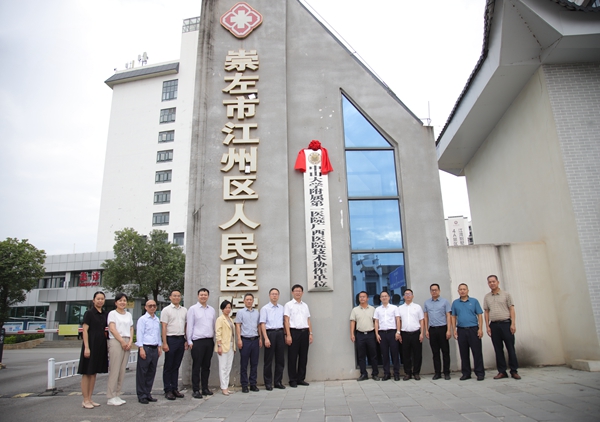 李健与陈新艺代表两院在会上进行签约,李健向江州区人民医院颁发技术协作单位牌匾。仪式后双方进行技术协作单位揭牌及合影留念。