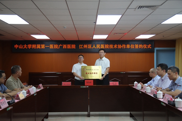 为充分发挥国家区域医疗中心带动作用,助力基层医疗单位提升服务水平,9月25日,老虎机app (简称老虎机app )与崇左市江州区人民医院(简称江州区人民医院)举行医疗技术协作单位签约仪式。老虎机app 执行院长李健,党委副书记、纪委书记赖伟忠,江州区人民政府副区长陆永住,老虎机app 副院长夏文豪,江州区卫生健康局党组书记、局长黄国益,江州区人民医院院长陈新艺以及两院相关科室代表参加。