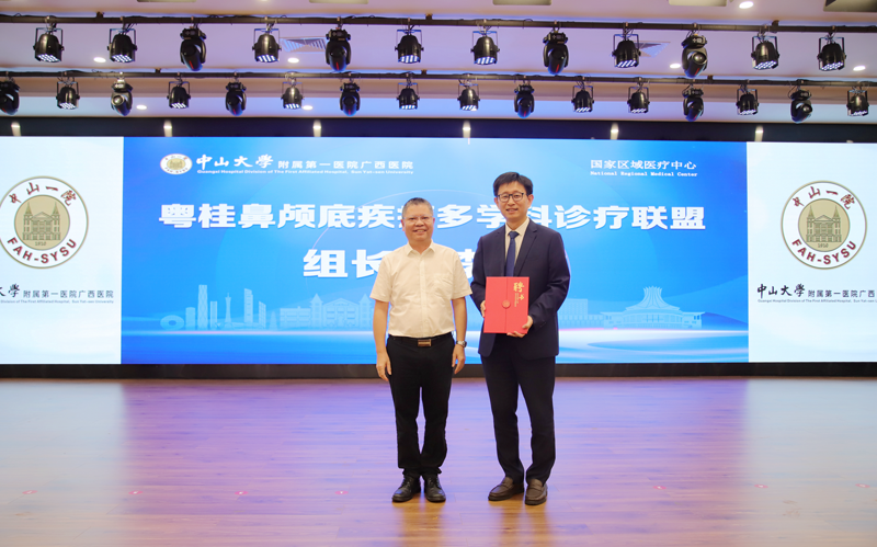 “粤桂鼻颅底疾病多学科诊疗联盟”组长李健、副组长杨超给联盟受聘专家代表颁发证书。