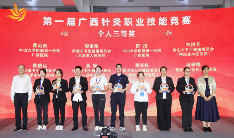 10月23日-24日,由自治区卫生健康委、自治区中医药局、自治区总工会、自治区疾控局联合主办的第一届全区针灸职业技能竞赛在广西南宁市举行,全区27支代表队共54名选手同台竞技。中山大学附属第一医院(简称中山一院)广西医院在本次竞赛中,以总分排名第四(综合医院排名第一)的成绩荣获团体三等奖,参赛选手黄远西、陈招在个人项目中获个人三等奖。