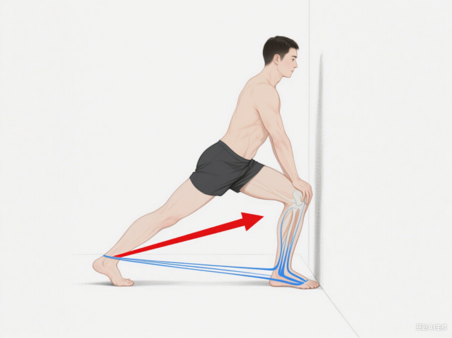 小腿拉伸:弓步站,后腿伸直,脚后跟踩地,感受小腿后侧肌肉的拉伸。这两个部位的拉伸对于缓解筋膜紧张至关重要。