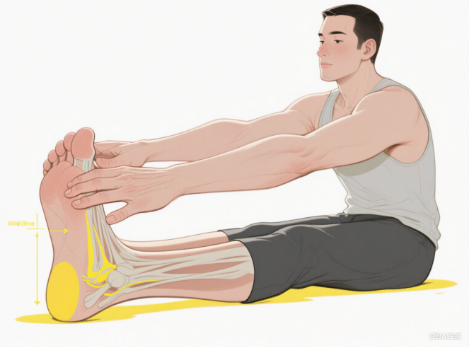 足底筋膜拉伸:坐姿,用手将脚趾向脚背方向掰,直到感觉足底有拉伸感。