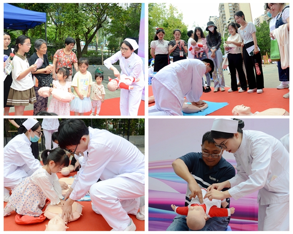在义诊现场,专家们围绕常见病、多发病以及慢性病等多种疾病问题,向现场群众普及医学常识和健康知识,引导群众科学就医,倡导健康生活方式。急诊科医护人员向居民们演示了单人徒手心肺复苏术和海姆立克急救法,帮助大家进一步掌握急救技能,提高应急自救能力。