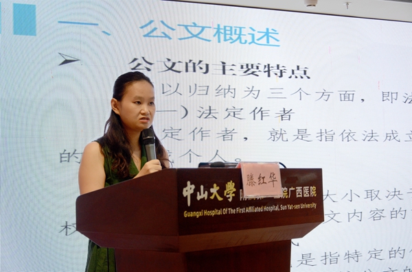 本次培训还得到了自治区卫生健康委的大力支持,并派出办公室副主任滕红华来院授课。滕红华长期从事文电管理工作,连续2年组织开展公文办理、会议筹备、文稿写作、服务保障等“提质效促落实”专题活动,编写《自治区卫生健康委“提质效促落实”专题行动成果汇编》,有效促进委机关公文质量提高。此次授课,她结合丰富的公文办理实例,从概述、种类、格式、行为规则与常见错情分析五个方面进行讲授,授课内容详实,使新员工获益匪浅。