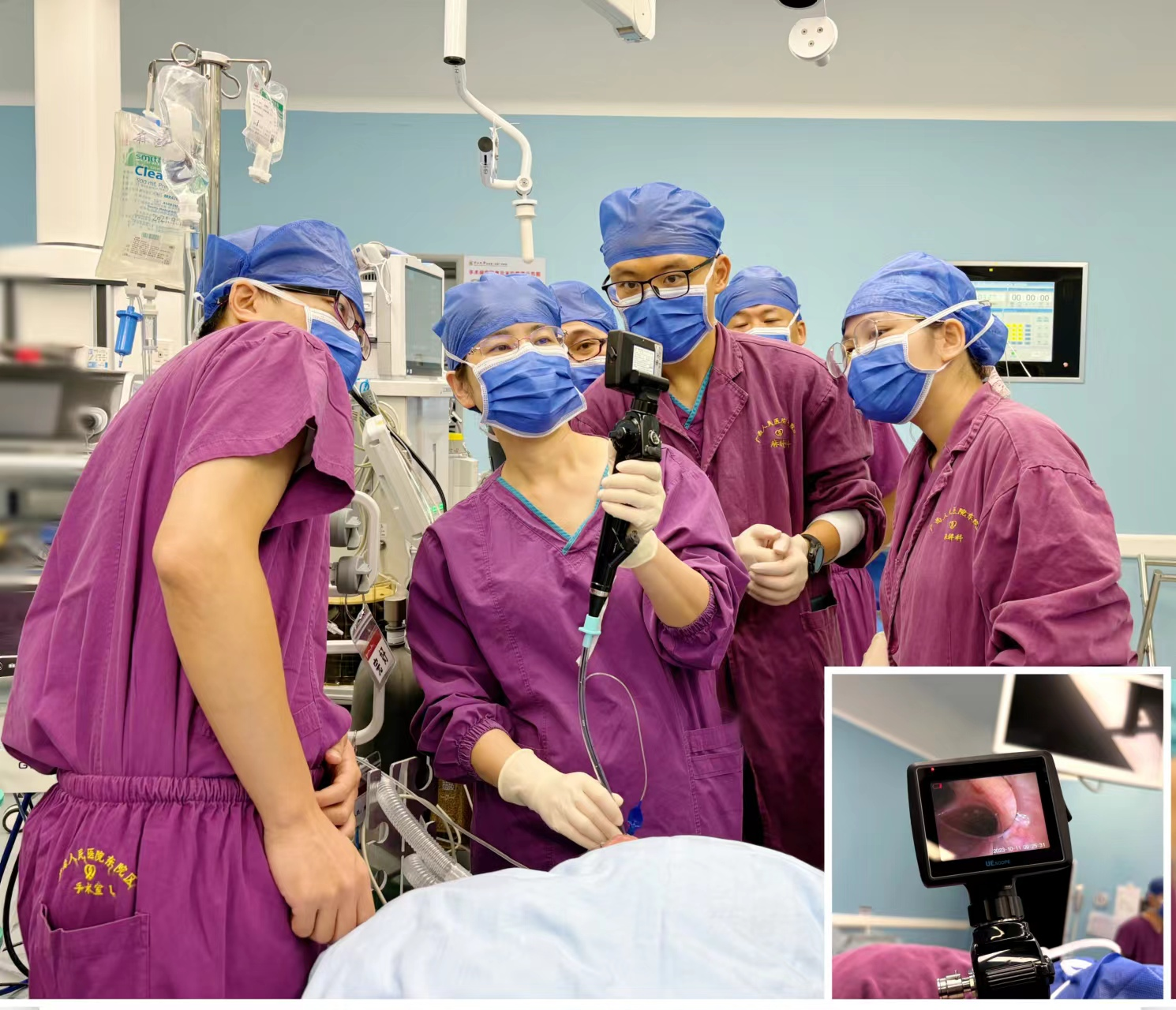 ▲麻醉团队为患者实施纤维支气管镜清醒气管插管