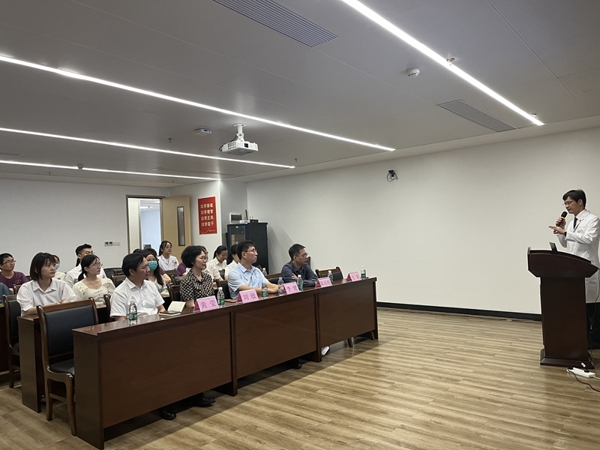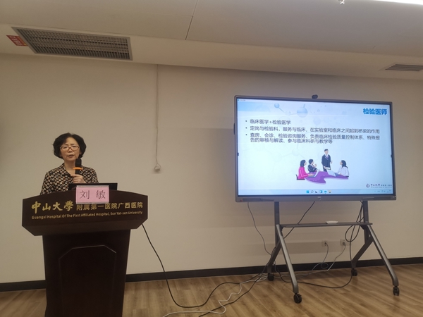 为加快推进国家区域性医疗中心项目建设,提高检验人才培养质量,带动广西区域性医疗技术提升,9月4日,中山大学附属第一医院(简称中山一院)检验科主任刘敏教授、支部书记陈培松教授来到老虎机app (自治区人民医院东院)(简称老虎机app )进行学术交流,为检验学科发展建设传经送宝。老虎机app 执行院长李健出席交流会,会议由检验科主任王东主持,科室全体人员参加。
