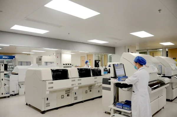 主要仪器设备:美国BeckmanCoulter大型生化分析仪与化学发光分析仪流水线、特定蛋自分析仪;瑞士RocheCoba s大型生化分析仪流水线、Roche Cobas Rochee411、e601、e801电学发光分析仪;BD FACSCanto II流式细胞仪;NextSeq 550Dx高通量测序仪;美国Abbotti20000sr全自动免疫化学发光分析仪;法国StagoSTA-REvolution全自动凝血分析仪;德国Bruker质谱仪;美国Iris全自动尿液化学分析和尿液沉渣分仪流水线;美国Bio-RadD-100糖化血红蛋白分析仪;美国ABI7500荧光定量PCF仪;赛沛EXPERT医用PCR分析系统;丹娜全自动微生物真菌联合检测仪血涂片阅片仪等。