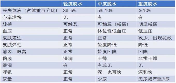 如何判断脱水程度主要依据丢失体液量、皮肤弹性、黏膜、前囟及眼窝凹陷程度、肢端温度、尿量、脉搏及血压的情况进行综合评估,分为轻度脱水,中度脱水及重度脱水(如下表)。