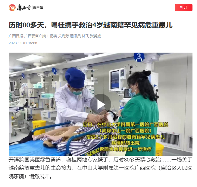 2023年9月,我院成功救治一名越南籍罕见病——“庞贝病”患儿,并在患儿出院时将其全程护送至东兴口岸,在边境与越南医护人员完成中越两国“爱的接力”。