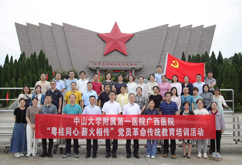 为深入学习贯彻习近平总书记关于革命传统教育的重要指示精神,以党建为纽带凝聚粤桂医疗专家力量,依托桂北地区丰富的红色资源,通过沉浸式教育实践,引导党员干部传承红色基因、赓续红色血脉,凝聚粤桂协作强大合力。9月28日,中山大学附属第一医院(简称中山一院)广西医院组织42名粤桂医疗专家及党员、入党积极分子,前往桂林市全州县开展“粤桂同心 薪火相传”党员革命传统教育培训活动。