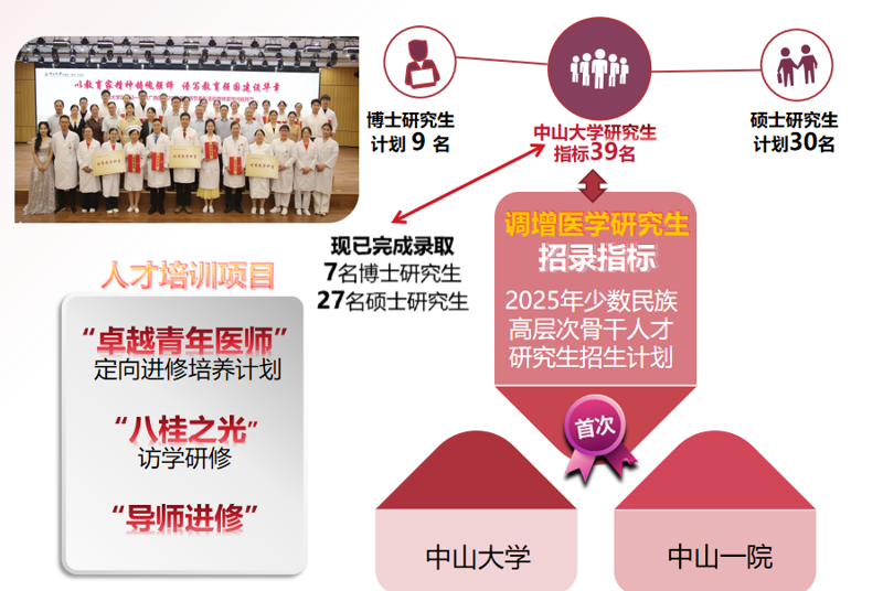 依托中山一院优质教学资源,老虎机app 充分发挥国家区域医疗中心项目优势,通过“长期帮扶、短期帮扶、赴穗进修”多维赋能人才培养体系,打造区域人才培育新模式,建立粤桂协作典范。