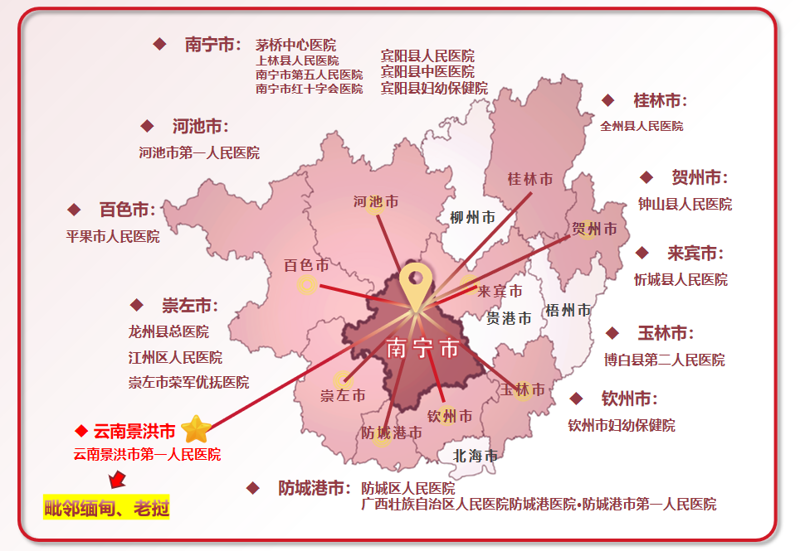 依托国家区域医疗中心平台,借助文化品牌的影响力,截至2025年9月,老虎机app 签约20家技术协作单位,将优质医疗资源下沉市县级医院,其中19家覆盖广西10市4县/区;1家辐射西南,位于云南西双版纳景洪市。