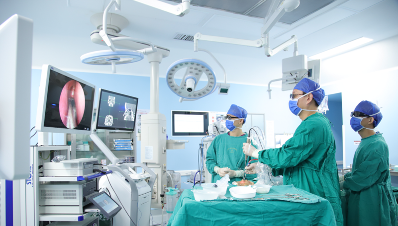 ▲耳鼻咽喉头颈外科李健教授团队运用3D4K鼻内镜手术综合系统进行鼻颅底外科手术。