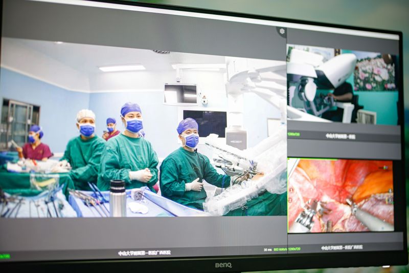▲中山一院副院长、胆胰外科学术带头人殷晓煜教授通过5G网络远程操控机器人手术系统完成跨越粤桂两地的远程机器人辅助巨大肝囊肿切除术。