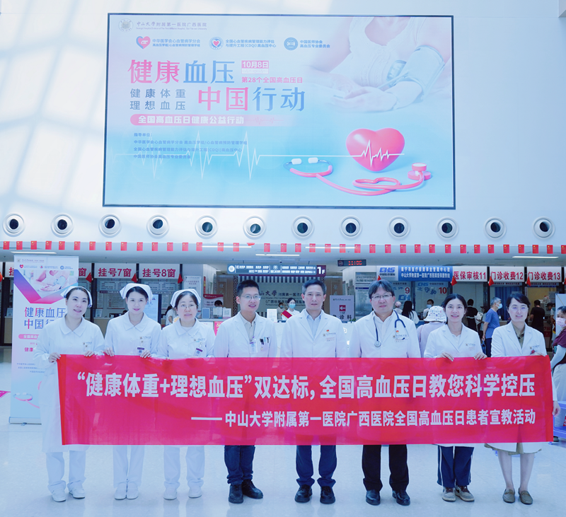 2025年10月8日是我国第28个“全国高血压日”,今年的主题为“健康体重,理想血压”。为提高公众对高血压的认知和防控意识,10月9日,中山大学附属第一医院(简称中山一院)广西医院举办了义诊及健康宣教活动,旨在广泛传播高血压防治知识,引导群众养成健康生活方式,提升高血压的知晓率、治疗率和控制率。