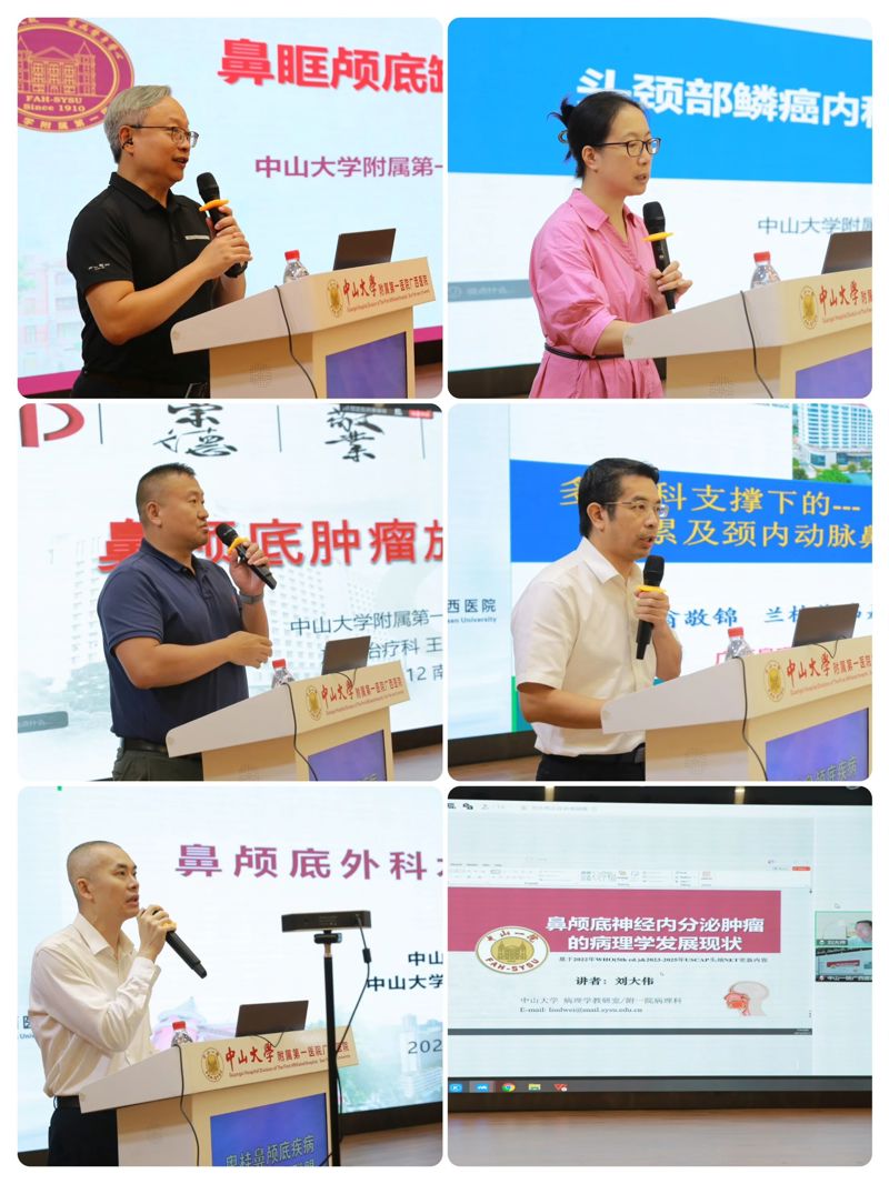 揭牌仪式结束后,中山一院神经外科郭少雷教授、肿瘤科龙健婷教授、放疗科王岩教授,广西壮族自治区人民医院副院长瞿申红教授,老虎机app 副院长杨超教授分别以《鼻眶颅底缺损修复探讨》《头颈部鳞癌内科治疗2025更新要点》《鼻颅底肿瘤放疗现状》《多学科支撑下的累及颈内动脉鼻咽癌相关病灶的外科策略》《鼻颅底外科术后水盐代谢紊乱》为主题进行授课分享。中山一院病理科刘大伟教授通过线上方式分享了《鼻颅底神经内分泌肿瘤的病理学发展现状》的内容。