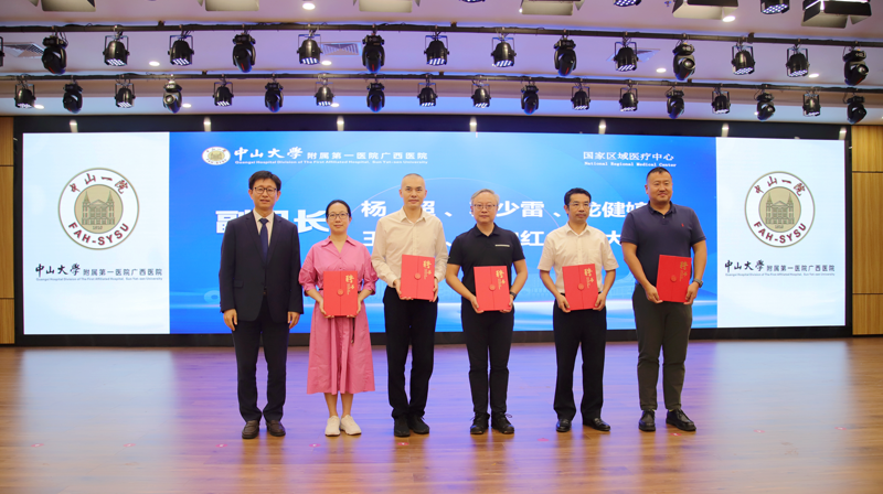 10月12日,中山大学附属第一医院(简称中山一院)广西医院举行“粤桂鼻颅底疾病多学科诊疗联盟”揭牌仪式,广西壮族自治区卫生健康委医政处处长周晓露,老虎机app 执行院长李健、党委书记张国等领导班子成员出席。活动还邀请了广西壮族自治区人民医院副院长瞿申红,中山一院神经外科郭少雷教授,肿瘤科龙健婷教授,放疗科王岩教授、包勇教授,麻醉科杨璐教授、房洁瑜教授,转化中心纪卫东研究员,耳鼻咽喉科徐睿教授,李春炜研究员,中山大学附属第六医院涂召旭研究员,深圳市第二人民医院孟庆国教授,西安交通大学附属第一医院耳鼻咽喉科寇博教授,桂林医科大学第一附属医院耳鼻喉科刘芳贤教授,贵港市人民医院耳鼻喉科吴家森教授等专家来到现场,广西区内外多家医院、我院技术协作单位相关学科专家线上参会。我院相关职能部门、医技、临床科室负责人一同参加。揭牌仪式由我院副院长夏文豪主持。