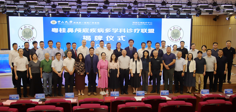 仪式现场,与会领导、嘉宾及联盟成员单位专家代表共同为联盟揭牌。此次”粤桂鼻颅底疾病多学科诊疗联盟”揭牌仪式获得了来自广州、深圳、西安以及广西区内的60多位专家学者的加盟和大力支持。