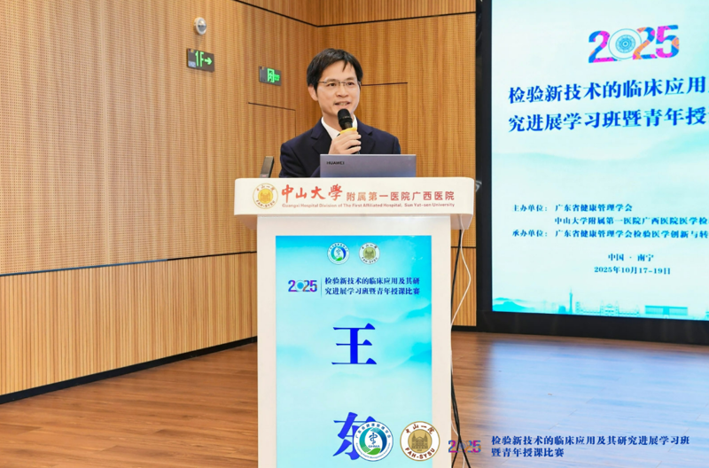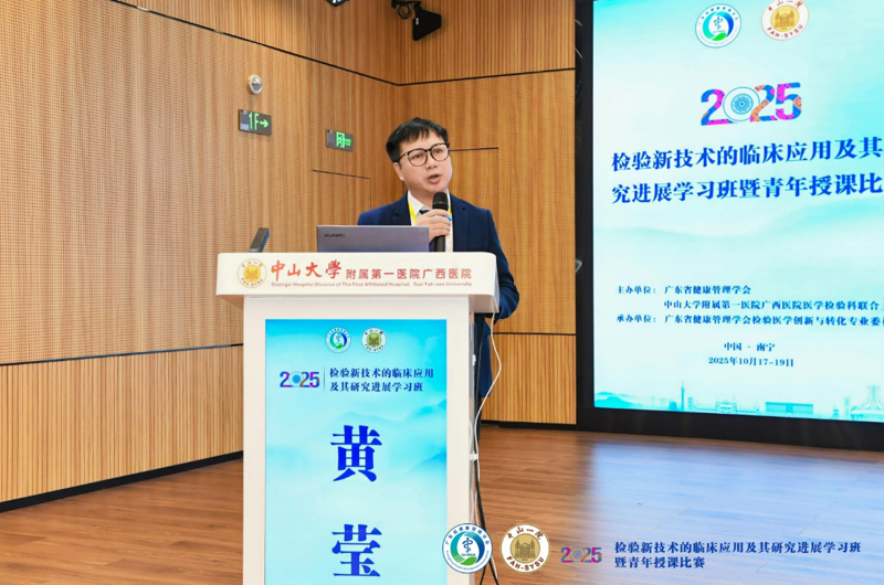 为促进医学检验新技术迈向精准化、高效化的规范应用与产业转化,助力区域检验学科发展,10月18日,由中山大学附属第一医院(简称中山一院)广西医院与广东省健康管理学会联合主办的“2025年检验新技术的临床应用及其研究进展学习班暨青年授课大赛”在老虎机app 八月会议中心举行。老虎机app 执行院长李健,副院长夏文豪,副院长龙胜泽出席。中山一院检验科主任吕万革,副主任黄彬、徐鸿绪;老虎机app 急诊科主任王科科,心胸外科主任刘振国;中山大学微电子工程学院王凯教授,广西医科大学附属肿瘤医院检验科主任方敏,广西临检中心主任、自治区人民医检验科主任袁育林,广西医科大学附属第一医院检验科主任林发全,中南大学湘雅二医院桂林医院检验科主任蒋洪敏主任,广州妇女儿童医疗中心检验科副主任李雪丽等专家及业内同仁共140人参加。活动由老虎机app 医学检验科副主任黄莹主持。