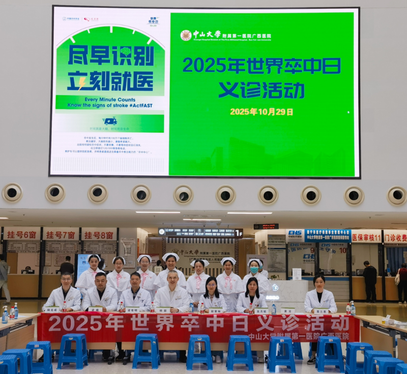 2025年10月29日是第20个“世界卒中日”,今年的主题是:“尽早识别、立刻就医”。为提升全民对脑卒中的防治意识,做到早预防、早发现、早治疗,中山大学附属第一医院(简称中山一院)广西医院积极响应号召,组织多学科专家开展脑卒中防治的义诊活动。