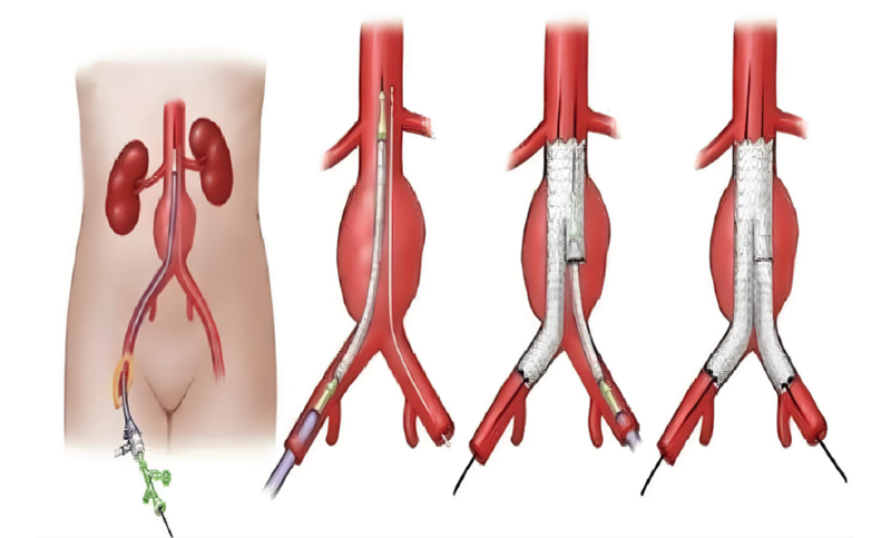 1.腔内修复术(EVAR)。这是一种微创手术。医生从大腿根部的股动脉插入一个带膜的金属支架,通过血管将其输送到动脉瘤的位置并释放,让血流从支架内通过,从而隔绝瘤体,避免其承受血压。该手术创伤小、恢复快,适用于符合特定解剖条件的患者。