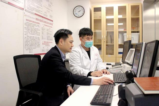▲冯仕庭在CT操作间向技术员传授扫描技巧