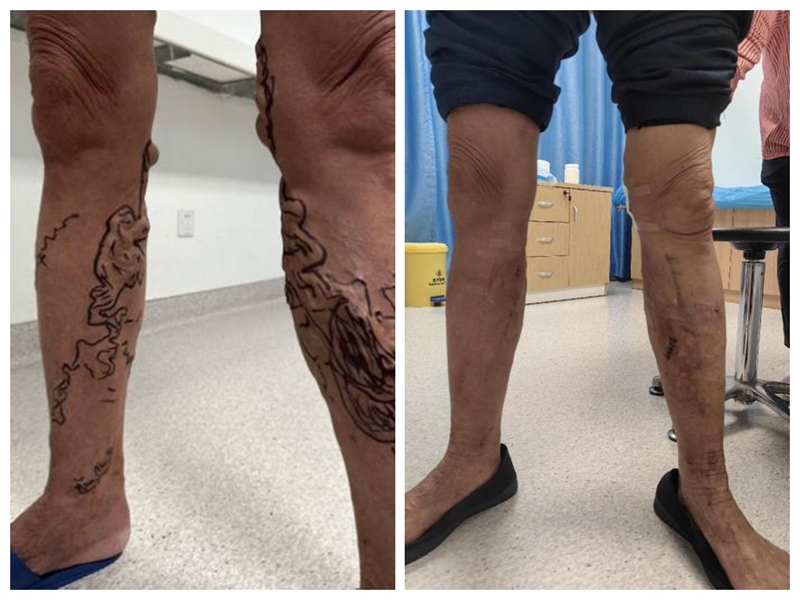 ▲左图:术前患者双下肢静脉严重迂曲如蚯蚓状,部分血管内血栓形成。右图:术后1周表面未见明显曲张静脉,腿部小切口愈合良好,患者无疼痛感,活动自如。
